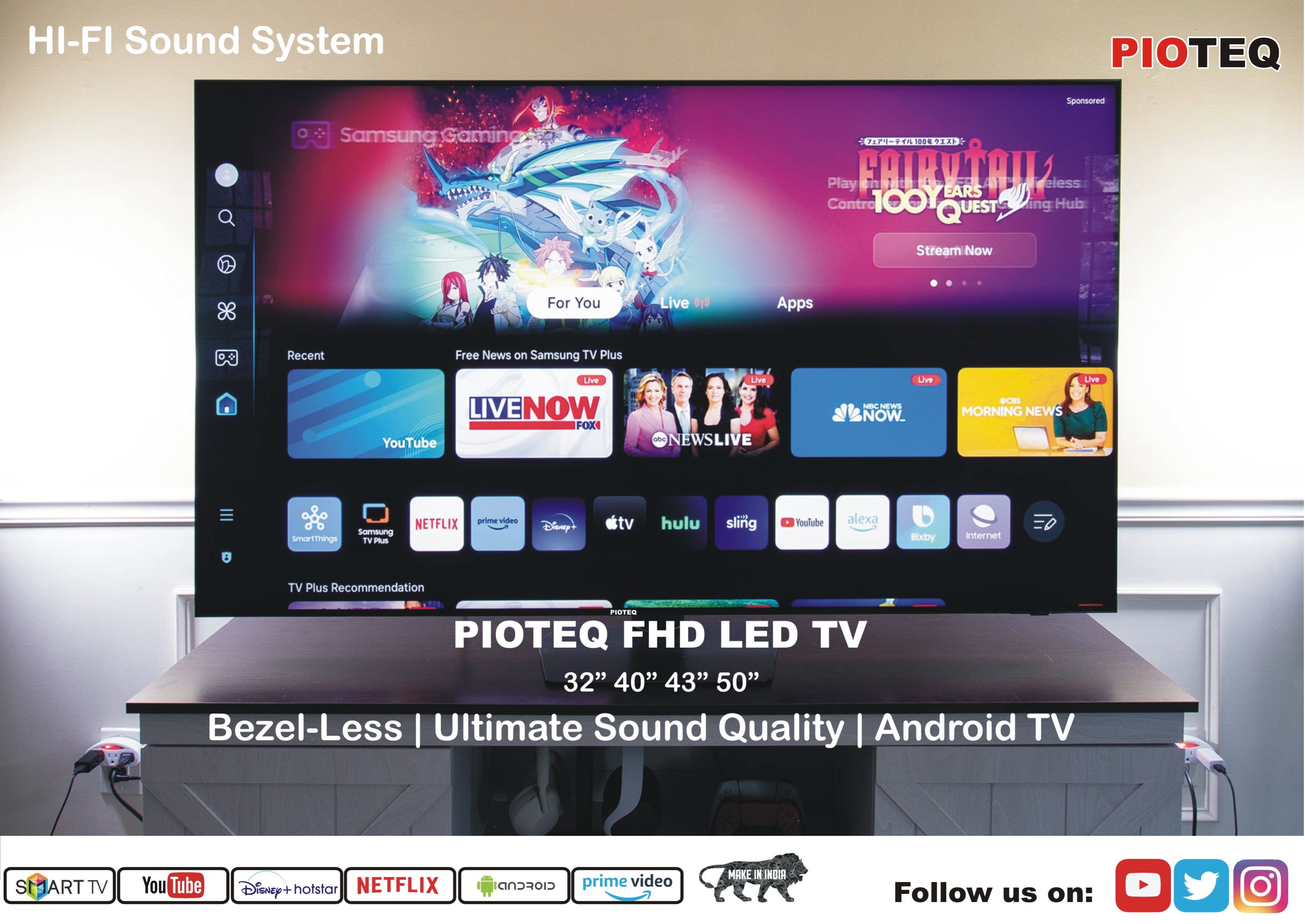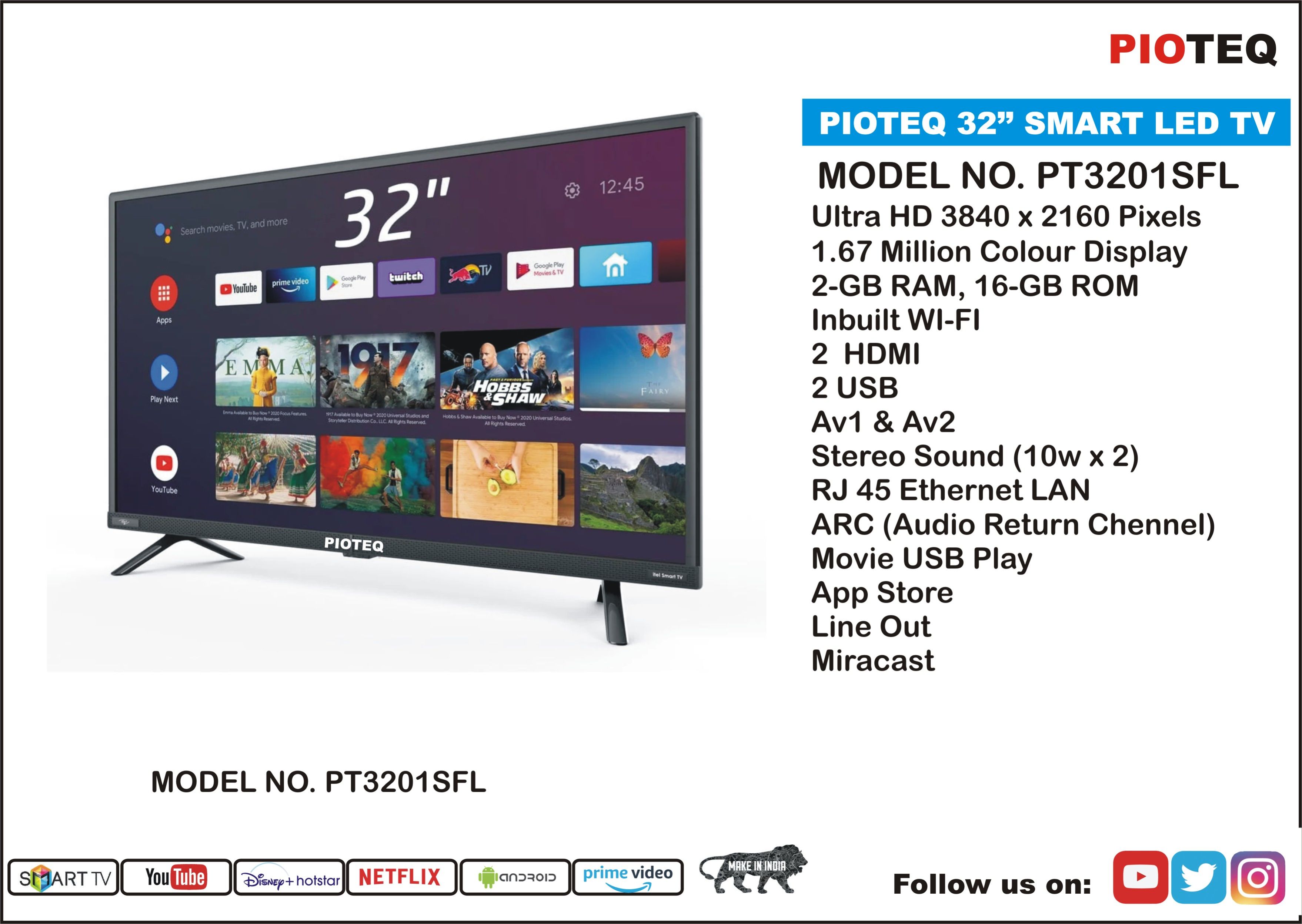 Screen Size 32 Inches Brand PIOTEQ Display Technology LED Resolution 1920X1080P RAM 2GB ROM 16GB VERSON ANDROID 11 Refresh Rate 60 Hz Special Feature IPE Technology | Optimum range remote with shortcut keys |True Display | Android OS | HDR-10 | Wide Color Gamut | Supported Applications : Sony Liv, Disney+Hotstar, Zee5, YoutubeIPE Technology | Optimum range remote with shortcut keys |True Display | Android OS | HDR-10 | Wide Color Gamut | Supported Applicatio… See more Included Components 1 LED TV, 1 Table Top Stand, 1 Wall Mount Bracket, 1 User Manual, 1 Warranty Card, 1 Remote Control Connectivity Technology Wi-Fi, USB, Ethernet, HDMI Product Dimensions 72D x 20W x 42H Centimeters Supported Internet Services Netflix, Prime Video, Zee5, Eros Now, JioCinema, SonyLiv, Youtube, Hungama, Hotstar