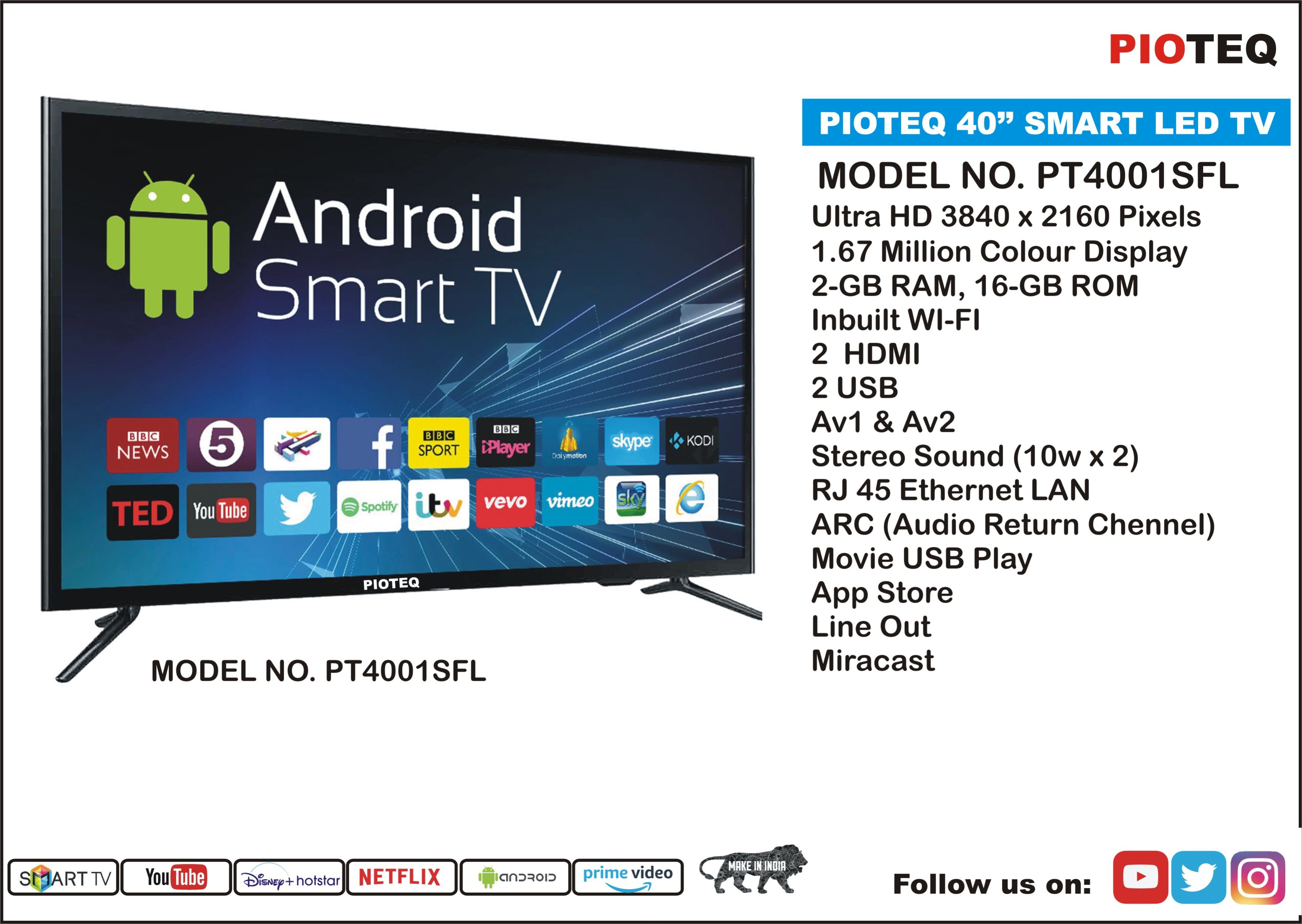 Screen Size 40 Inches Brand PIOTEQ Display Technology LED Resolution 1080p Refresh Rate 60 Hz Special Feature Full HD Android TV |In-Built Wi-Fi | Screen Sharing | 1 GB RAM |8 GB ROM | 64-bit Quad Core Processor |Ai-Clarity|Multi View Mode| T-Screen |178 Degree Wide Viewing Angle | AiPQ Engine | HDR 10 |Micro Dimming | Bezel-Less Design|In-Built Apps: Netflix, Prime Video, Disney+HotstarFull HD Android TV |In-Built Wi-Fi | Screen Sharing | 1 GB RAM |8 GB ROM | 64-bit Quad Core Processor |Ai-Clarity|Multi View Mode| T-Screen |178 Degree Wide Vie… See more Included Components 1N LED TV, 1N Stand, 1N User Manual, 1N Warranty Card, 1N Remote Control, 2N Batteries ( The wall mount is not included in the box and will be chargeable)1N LED TV, 1N Stand, 1N User Manual, 1N Warranty Card, 1N Remote Control, 2N Batteries ( The wall mount is not included in the box and will be chargeable) Connectivity Technology Wi-Fi, USB, Ethernet, HDMI Aspect Ratio 16:9 Product Dimensions 18.4D x 89.2W x 55.8H Centimeters